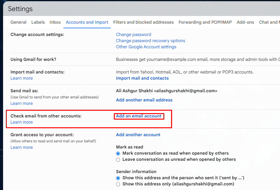 2. Go to Accounts and Import, go to Check email from other accounts, and click on Add an email account to connect Webmail with Gmail.