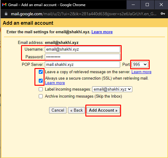 5. Enter your full webmail username and password, select port 995, check the two boxes, and click on add account.