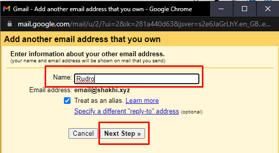 6. Enter the name that will be shown to the receiver of the mail, check the box, and click on next step.
