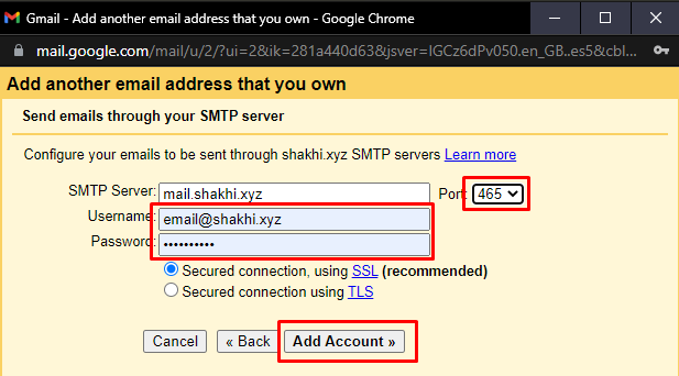 7. Enter your webmail and password again, select port 465 for SSL or 25 for this, check the box according to the port, and click add account.