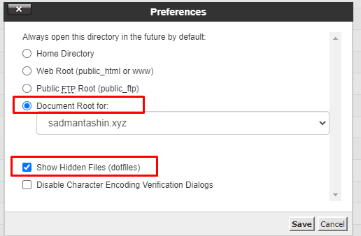 4. There are 4 types of category. Such as a. Home Directory, b. Web Root(public_html or www), c. Public FTP Root(public_ftp), d. Document Root for. Select your document root and there are two types: a. Show Hidden files, b. Disable Character Encoding Verification dialogs. Check the box of Show Hidden Files (dotfiles) then click on Save as below seen –.Then you can easily learn how to show cPanel hidden files.